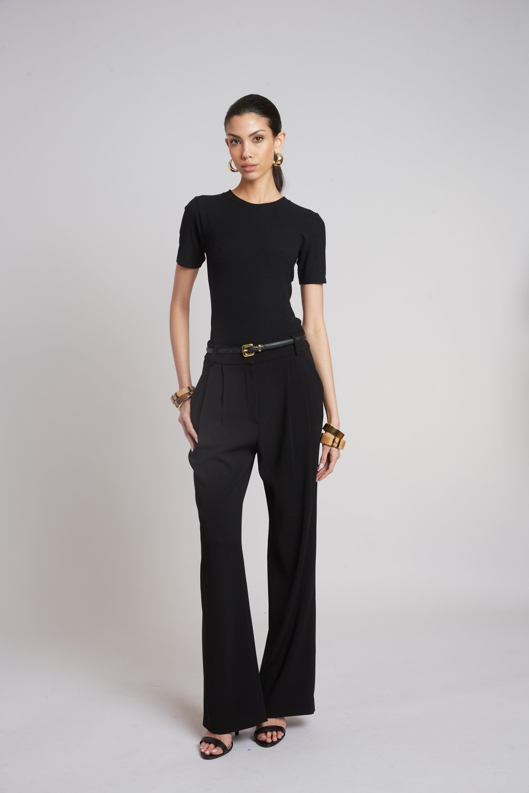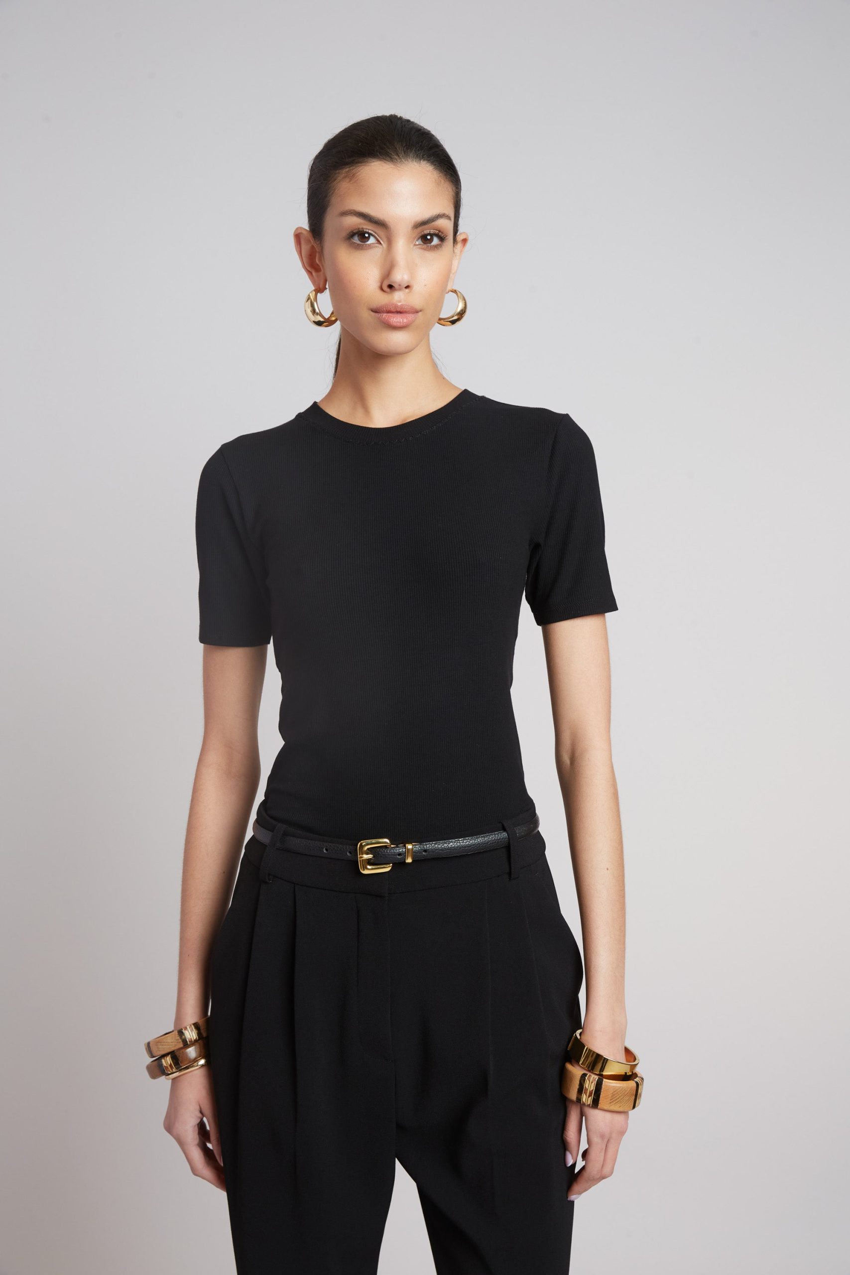 A study in refined simplicity, this short sleeve tee is crafted in finely ribbed knit to trace the form with ease. The subtle stretch and clean finish lend quiet structure, while its minimal silhouette makes it a foundation piece—precise, effortless, enduring.