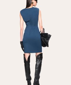 Crafted in double-knit ponte, this sleeveless dress is defined by strong shoulders and artful side ruching, sculpted with subtle strength and refined detail.
