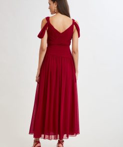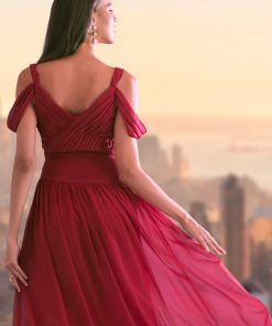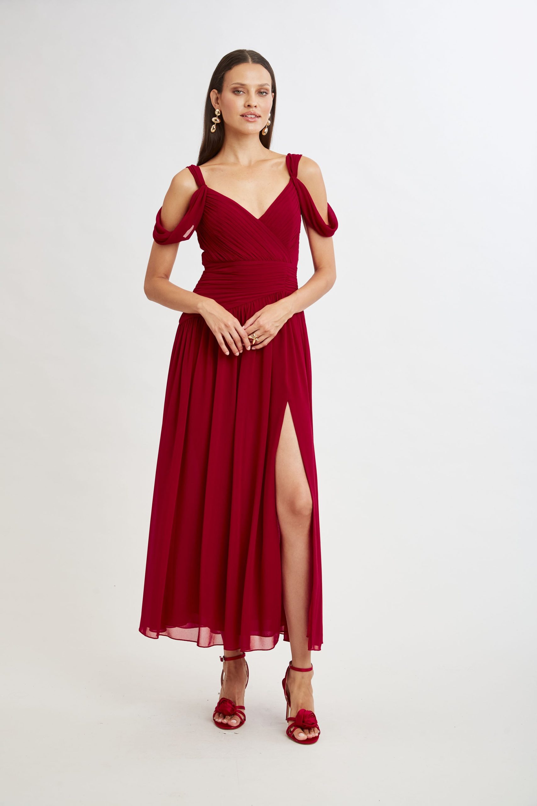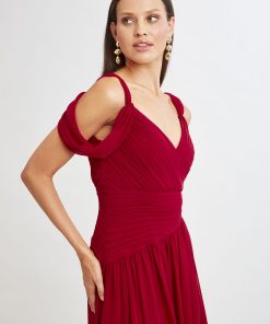 Step into elegance with our Georgette Gown. Designed with delicate pleat detailing on the bodice and waist and draped cold shoulder straps, and a fluid slitted skirt, this gown flows effortlessly with each step.