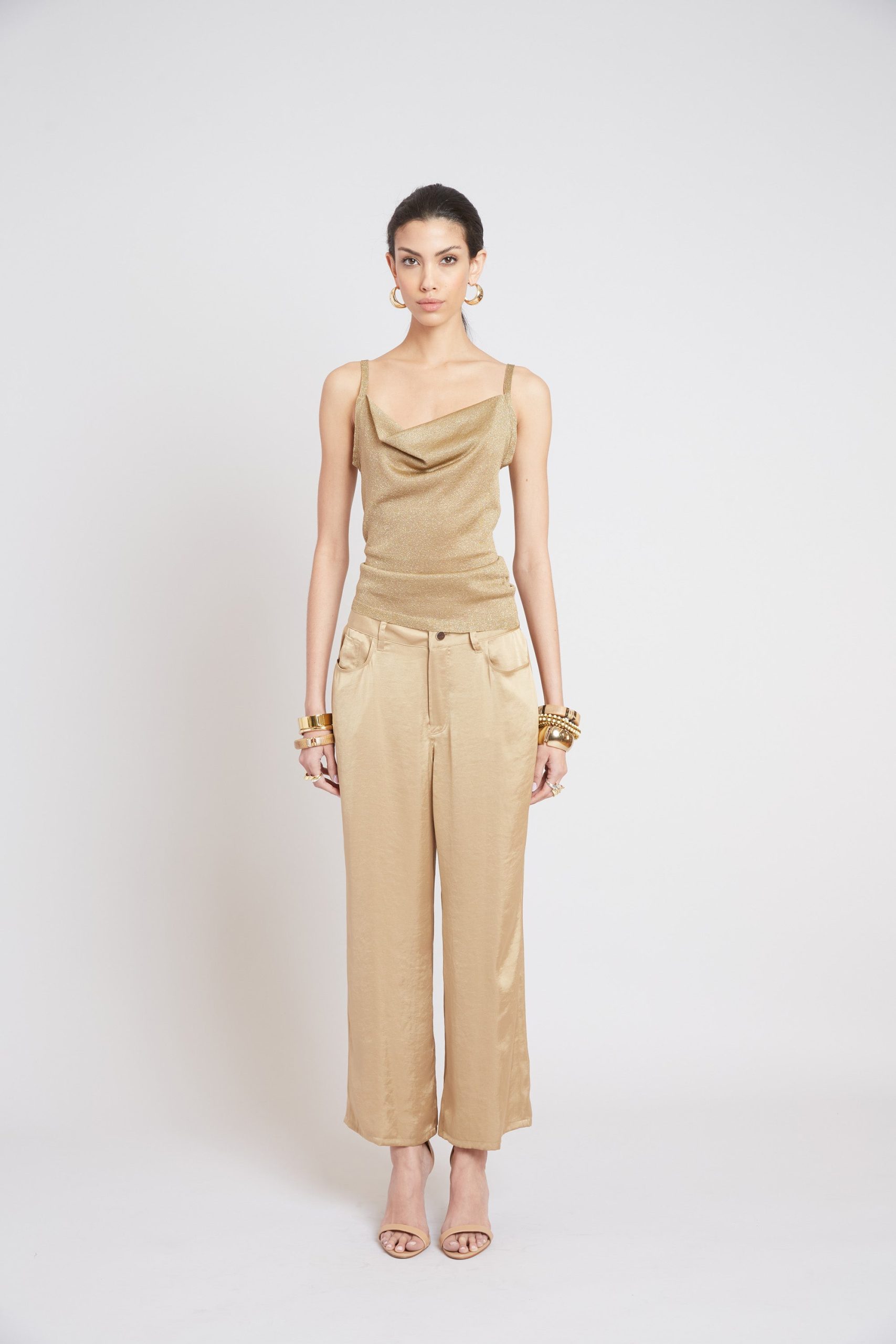 Nothing beats the chic factor and luxe patina of our metallic knit Cami. Detailed with a soft cowl neckline, our Metallic Cowl Tank is perfect for channeling a glam vibe. Wear it layered under a Blazer or on its own for a modern femme vibe.