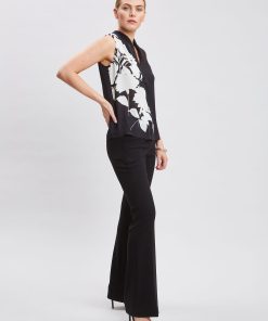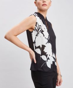 Midnight Garden Floral sleeveless, pleated shoulder top with stand collar and split neckline