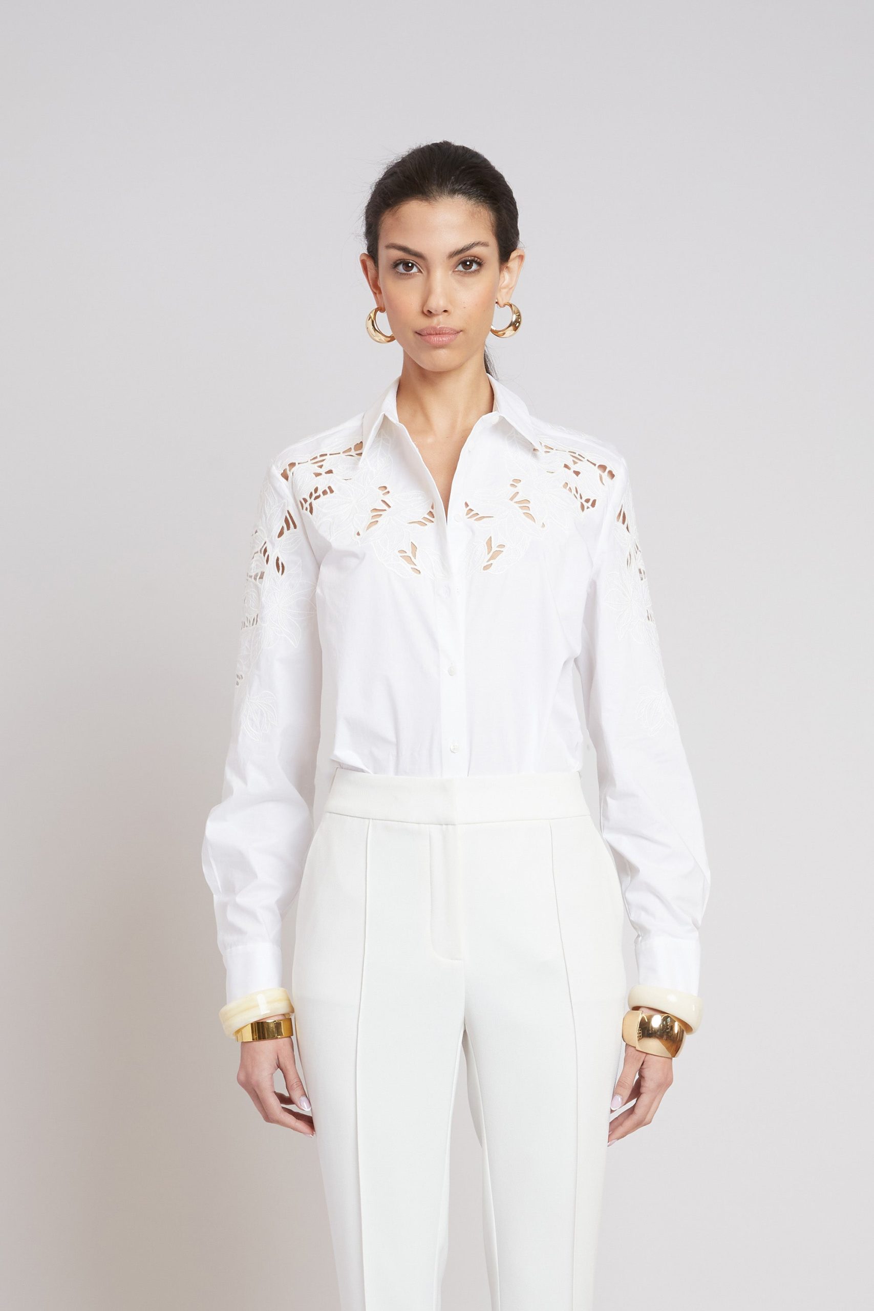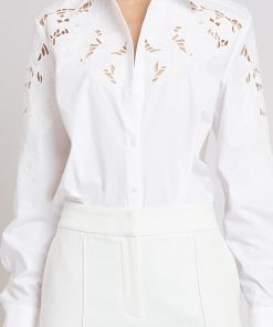 Long Sleeve Cotton Shirt with Openwork Shoulder Embroidery