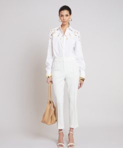 A reimagining of the classic button-down, this crisp cotton shirt is punctuated by openwork lace embroidery at the shoulder—an unexpected interplay of structure and softness. Tailored yet undone, it balances tradition with quiet provocation.