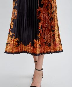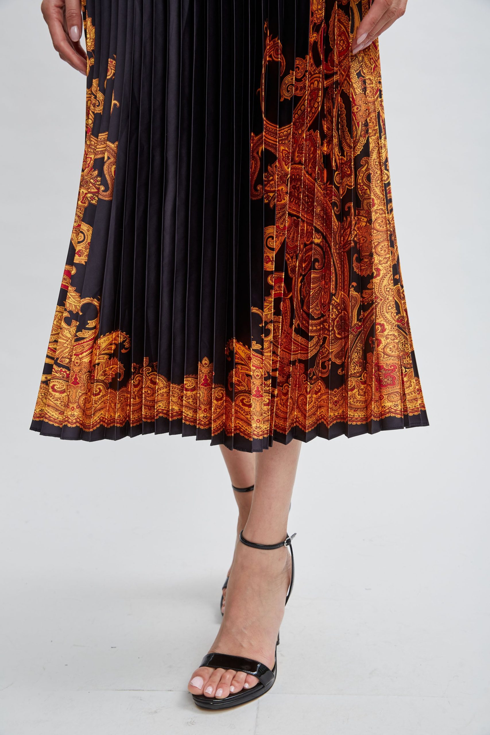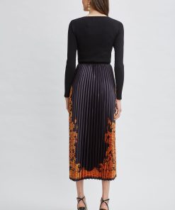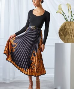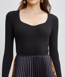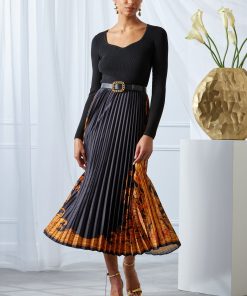 Our effortless Pleated Midi Dress has a distinct modern vibe. The sweetheart neckline viscose sweater knit bodice combines with an artistic scarf print. Definitely poetry in motion!