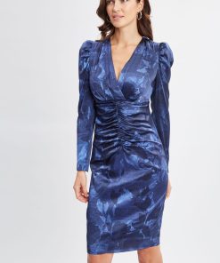 Long Sleeve Silk Satin Printed Dress with Ruching Affect & Puff Shoulders