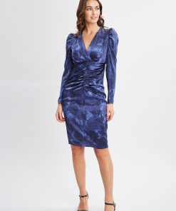 Go glam our in body skimming Silk Satin Night Shadow Print Dress. Fitted in all the right places, the sexy v-neckline & ruching throughout make it ultra-flattering while the rich patina make it the perfect occasion dress.